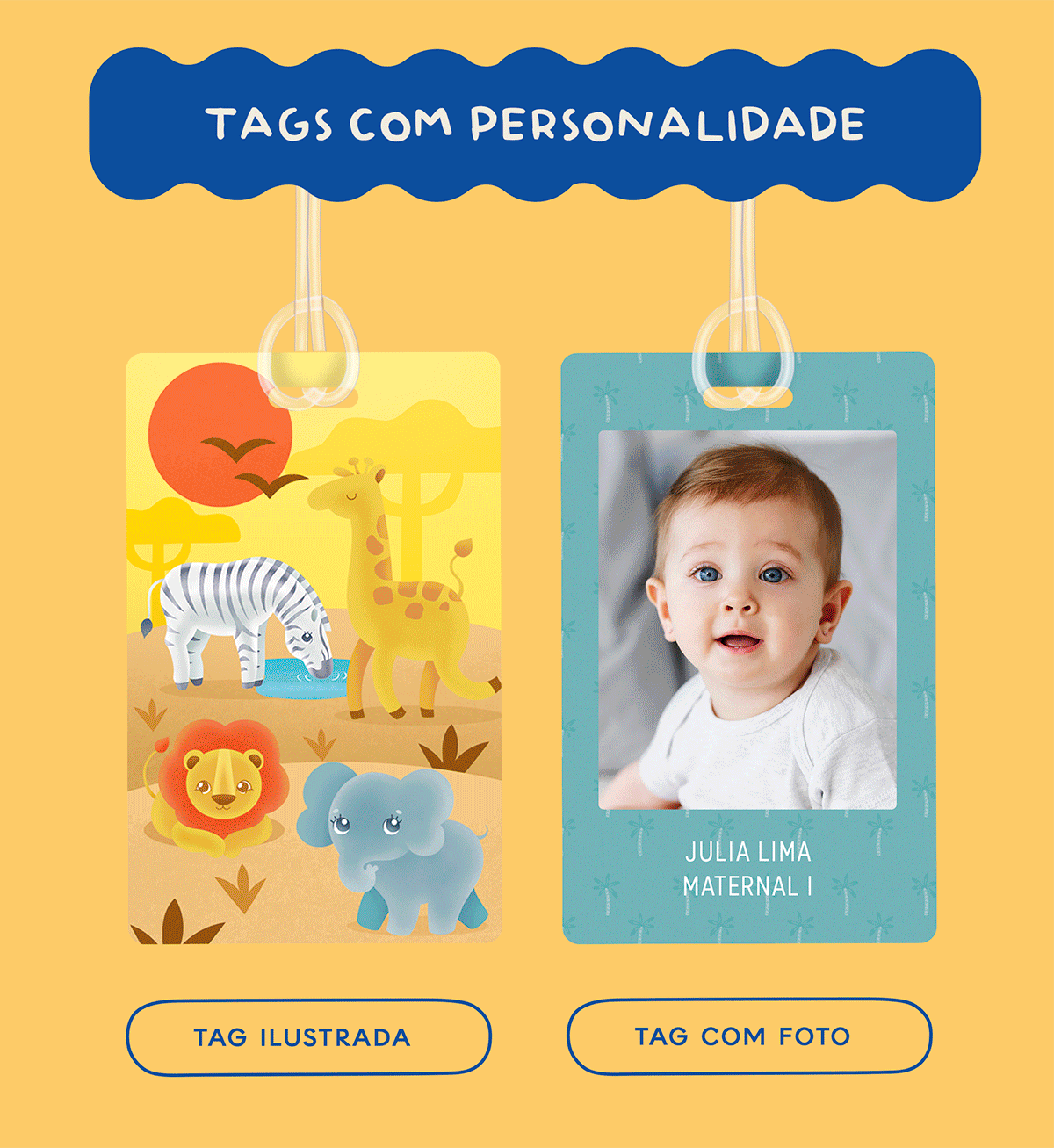 Produzidas com impressão de alta qualidade, nossas tags possuem ótima durabilidade, não desbotam facilmente e suportam o uso diário, mesmo em rotinas escolares intensas. A personalização com o nome da criança torna a identificação rápida e clara para professores, cuidadores e escolas.